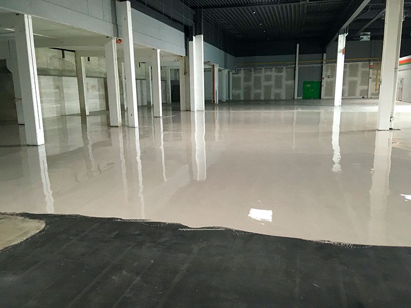 Eine wichtige Aufgabe war, den gesamten Untergrund – insgesamt etwa 4.000 Quadratmeter – planeben wiederherzustellen. Neben der normalen Schichtdicke von zwei bis drei Millimetern waren auch erheblich Bereiche mit höheren Schichtdicken, teilweise bis zu 20 Millimeter, zu erstellen. Zementäre Spachtelmassen waren aufgrund ihres unvermeidbaren Schwindverhaltens auf den Gussasphaltuntergründen keine Option. Für Lars Beyerstedt kam nur ein Produkt in Frage: AS 1 Rapid. Mit der Calciumsulfat-Spachtelmasse von THOMSIT konnte er in nur einem Arbeitsgang eine besonders glatte Bodenfläche herstellen. Wegen der großen Materialmenge und den benötigten hohen Schichtdicken erfolgte der Einbau im Pumpverfahren. Die entstandene Oberfläche ist hochfest und trocknet zudem spannungsarm aus.